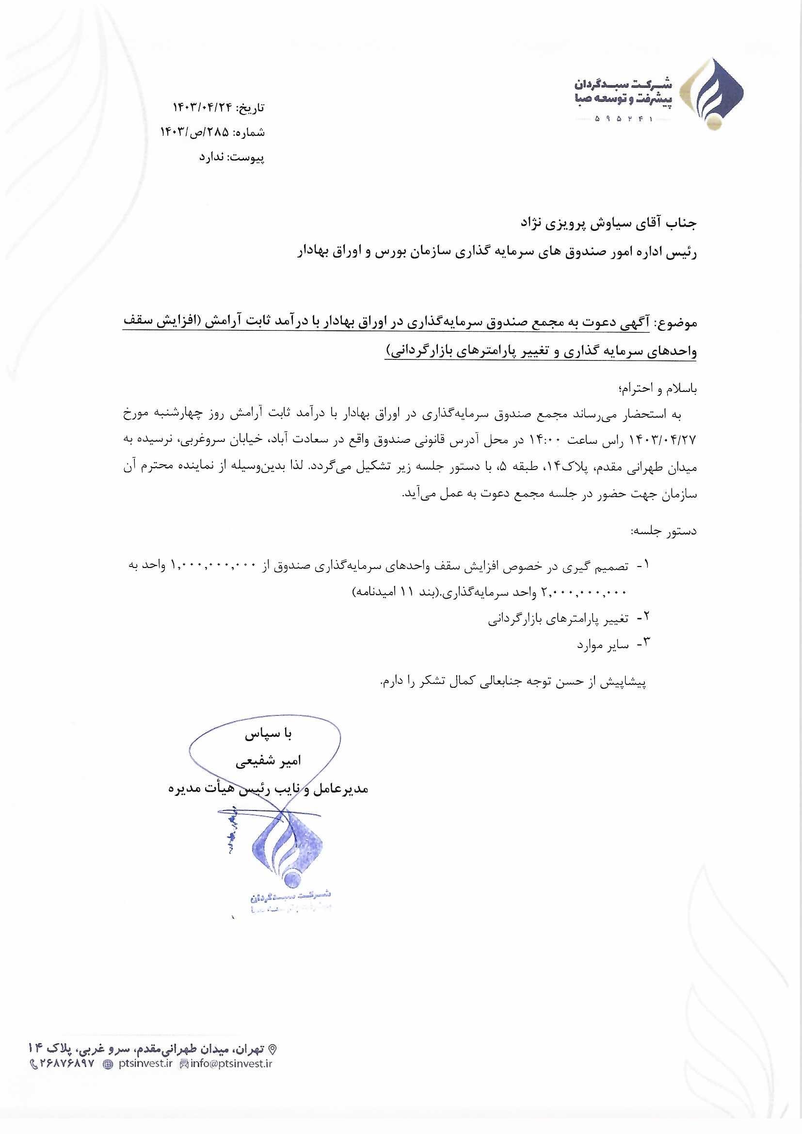آگهی دعوت به مجمع موضوع افزایش سقف واحدهای سرمایه گذاری و تغییر پارامترهای بازارگردانی صندوق مورخ ۱۴۰۳/۱۰/۰۸