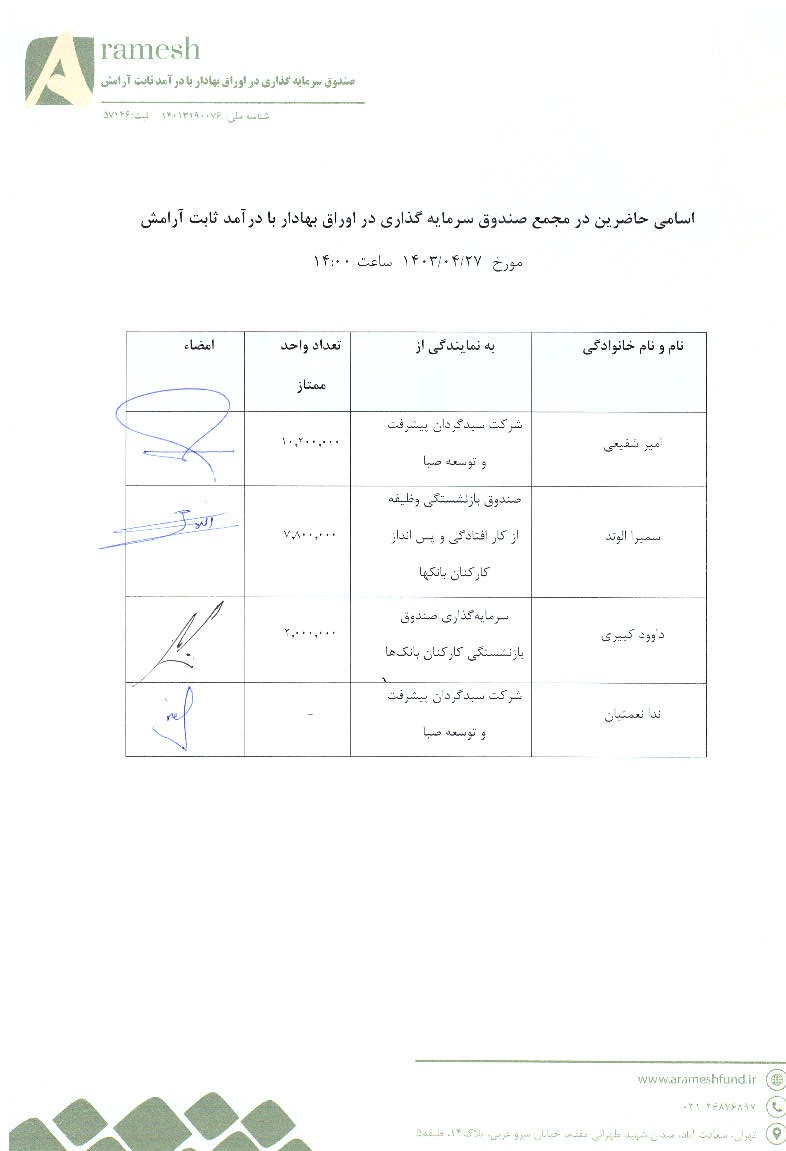 اسامی حاضرین در جلسه مجمع تغییر کارمزد مدیر صندوق بادرآمد ثابت آرامش