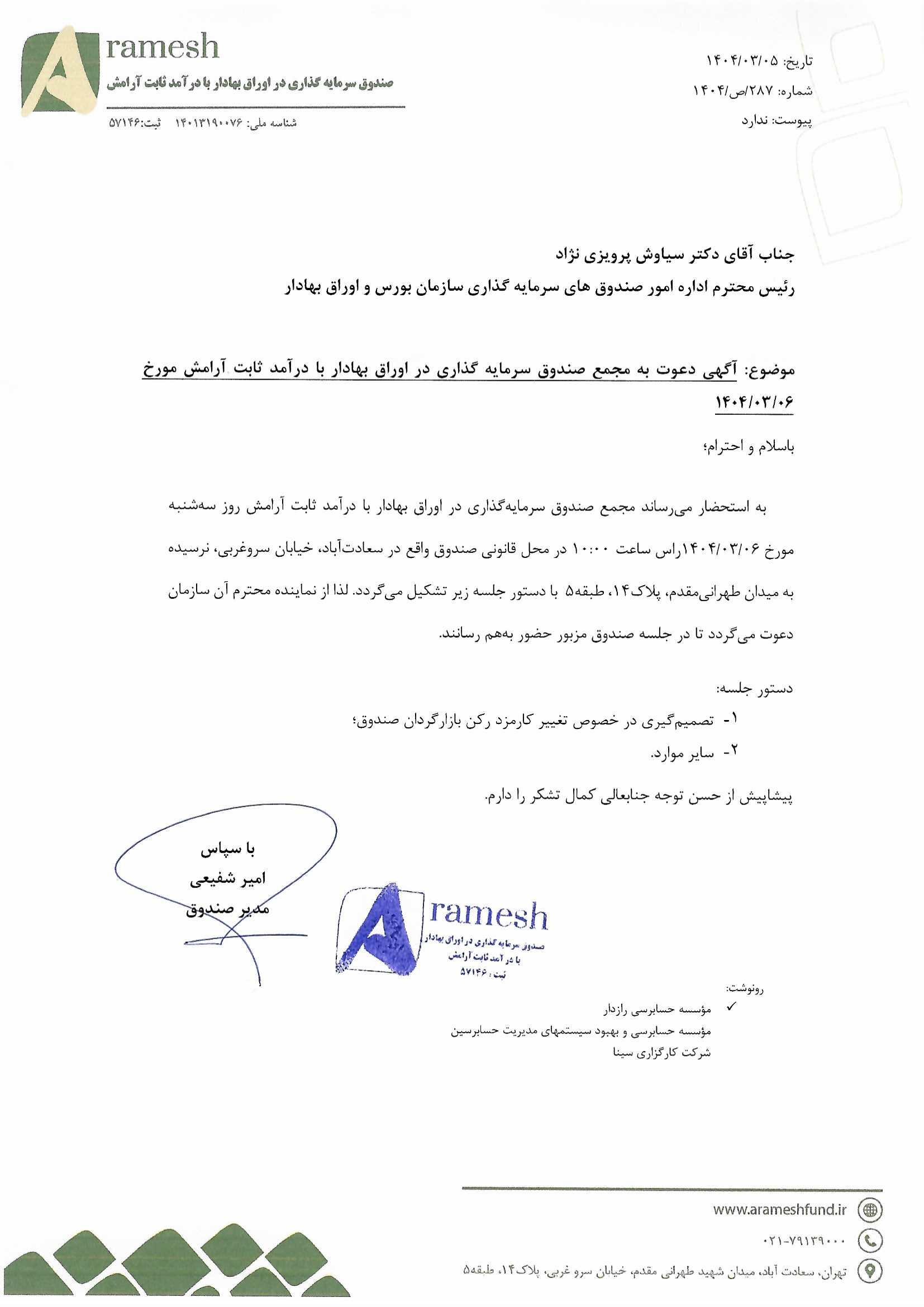 اسامی حاضرین وآگهی دعوت به جلسه مجمع تغییر بازارگردان صندوق بادرآمد ثابت آرامش مورخ ۱۴۰۳/۰۸/۲۷